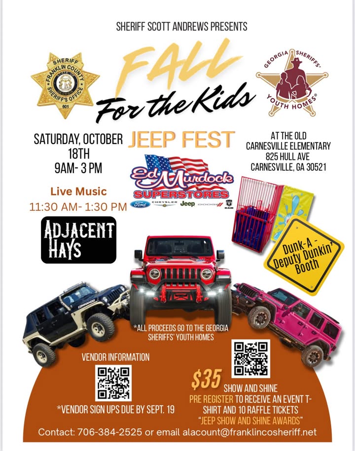 Fall For The Kids – Jeep Fest FacebookTwitter + Add to Google Calendar + iCal export Date Oct 18 2025 Time 9:00 am - 3:00 pm Local Time Timezone: America/New_York Date: Oct 18 2025 Time: 10:00 - 16:00 Location Old Carnesville Elementary School 825 Hull Ave, Carnesville, GA Share this event