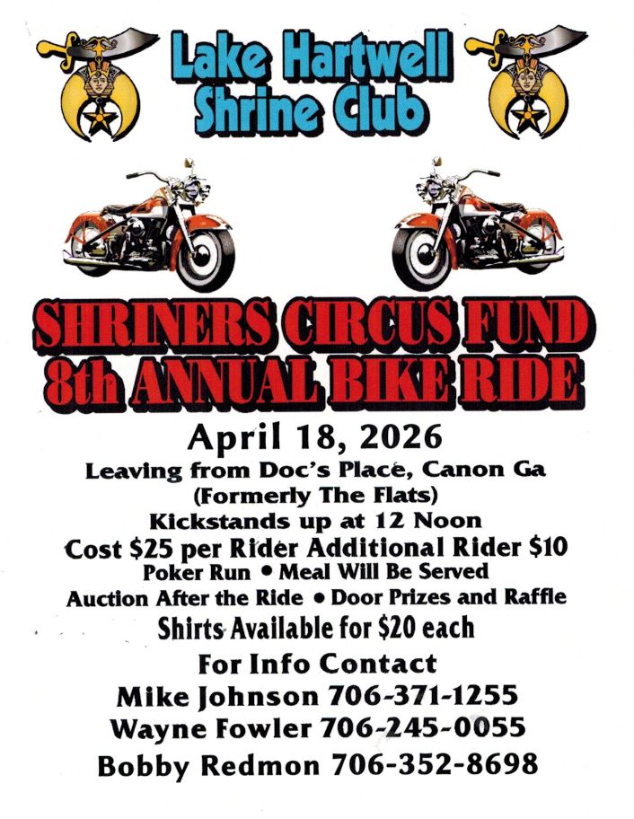 Lake Hartwell Shrine Club – Annual Bike Ride FacebookTwitter + Add to Google Calendar + iCal export Date Apr 18 2026 Time 12:00 pm Local Time Timezone: America/New_York Date: Apr 18 2026 Time: 12:00 - 18:00 Location Doc's Place 4195 GA-17, Canon, GA 30520 Share this event