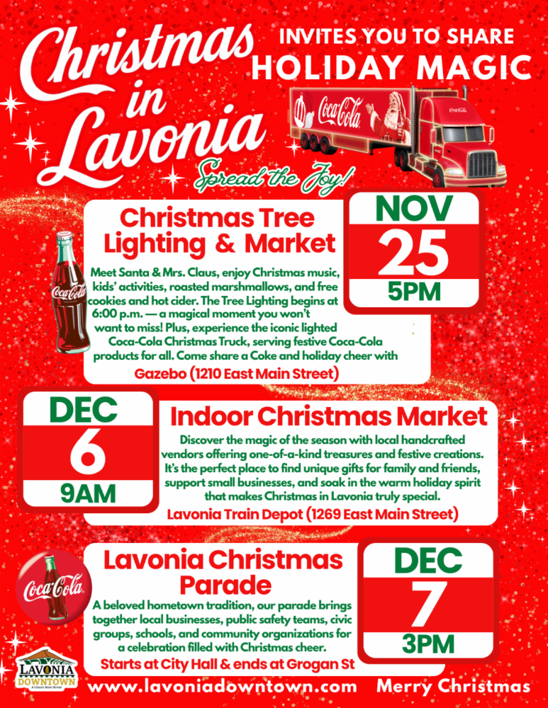 Don’t miss Lavonia’s Christmas Tree Lighting & Market. It will be held on Tuesday, November 25th from 5-7 p.m. at the Lavonia Gazebo on East Main St. The tree lighting will be at 6 p.m. Visit Santa & Mrs. Claus, enjoy Christmas music, activities for the kids, roasted marshmallows, and free cookies and hot cider. Don’t miss the iconic Coca-Cola Lighted Christmas truck will be onsite. Stop by for festive photos and enjoy complimentary Coca-Cola products as part of the celebration.