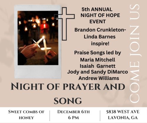 Sweet Combs of Honey offers a variety of local and regional products, including honey, Georgia grown food products, wine, home décor, wall art, and jewelry. Mark your calendars for the 5th Annual Night of Hope with Candlelight, Saturday, December 6th beginning at 6 p.m. Hear Praise and Worship music from Maria Mitchell, Isaiah Garnett, Jodi & Sandy Dimarco, and Andrew Williams. Prayers will be led by Brandon Crunkleton with Pleasant Grove Baptist Church and Pastor Linda Barnes. Free coats will be offered from the 2 Tunics Ministry. Also, enjoy the fire pit, free hotdogs and s’mores, hot cocoa and hot apple cider. The store will also be open for shopping.