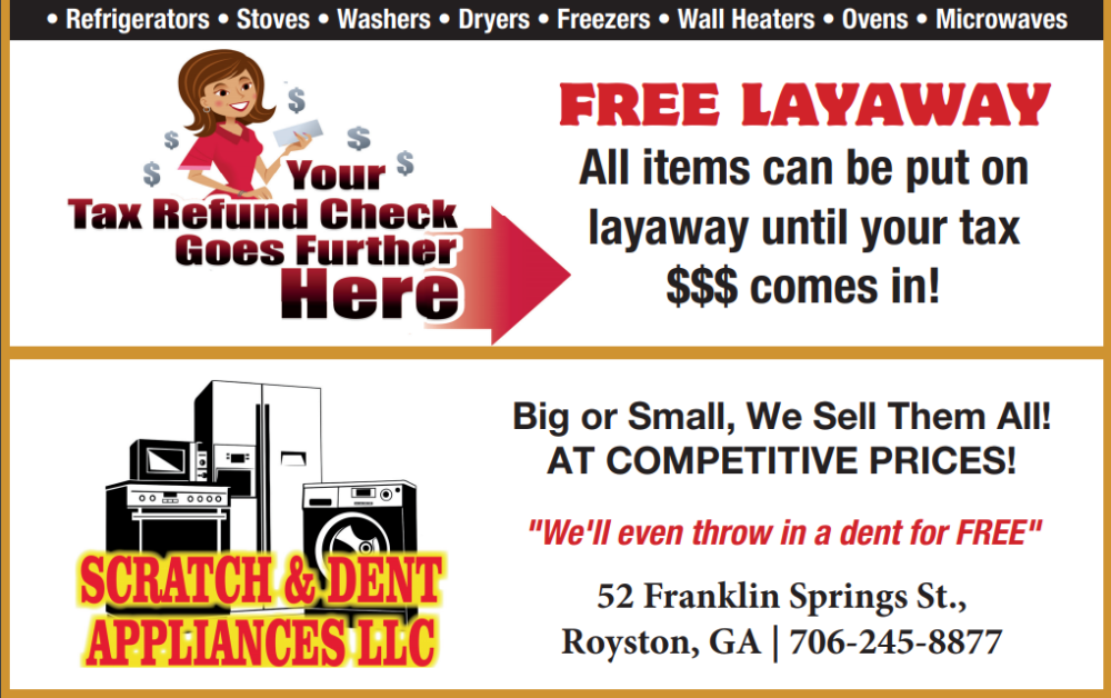 The 921 WLHR featured Business of the Week is Scratch & Dent Appliances in Royston, GA. Scratch & Dent Appliances is the one stop home appliance store, carrying many of the latest state-of-the-art appliances from major brands at very affordable prices. This gives their customers the most budget friendly options on a wide range of brands and appliances. It is tax season, and your tax refund check goes further at Scratch & Dent Appliances. All items can be put on layaway for free until your refund comes in.